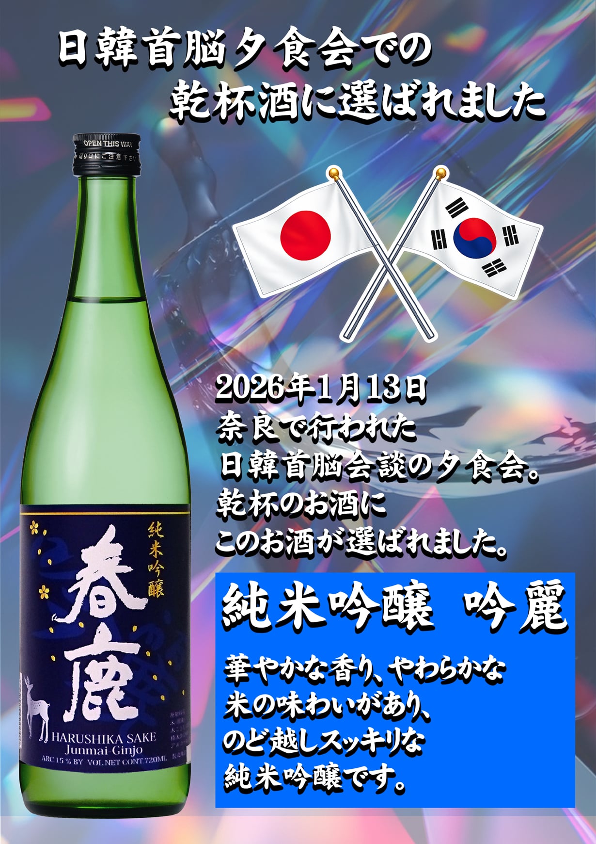 春鹿 純米吟醸 吟麗 火入れ酒 酒造好適米を使用し、華やかな香り、やわらかな米の味わいがあり、 ●アルコール分:15.5度 【ワイングラスでおいしい日本酒アワード2025☆金賞受賞】 2026.1.13 日韓首脳会談晩餐会の乾杯酒