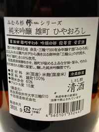三諸杉 純米吟醸 ワイングラスでおいしい日本酒アワード2015金賞受賞 香りは穏やかな吟醸香。含むと凝縮された米の旨みが広がった後、 適度な酸味によりキレていく。 一杯目よりも二杯目、二杯目より三杯目とお食事と共に杯が進む食中酒です。 原料米:露葉風・山田錦