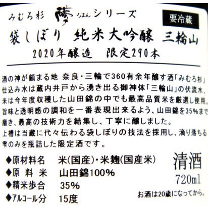今西酒造 みむろ杉 純米大吟醸35% 今西酒造 みむろ杉 純米大吟醸35 高橋活日命に捧ぐ 純米大吟醸規格ですが香り系ではありません。 720mlのみです。
