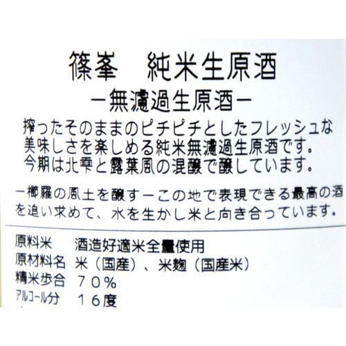 千代酒造 篠峯 こちらはオリの無いバージョンです。 共にコストパフォーマンスが取れたお酒です。 ■原料米、露葉風/北雫■精米歩合70% クール便でのお届けです。